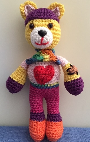 Naast de andere ontwerpen ziet u ook Lybe, het Steunknuffelbeertje tussen de Melody Swingsjaal.