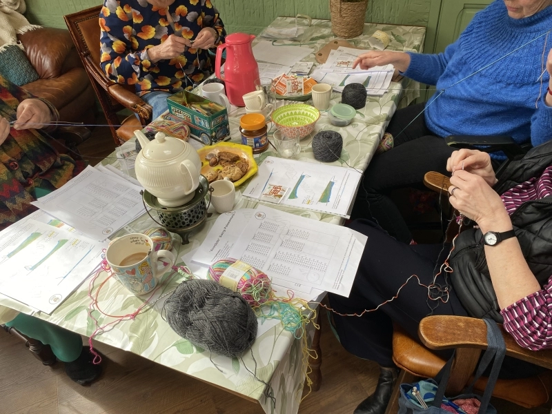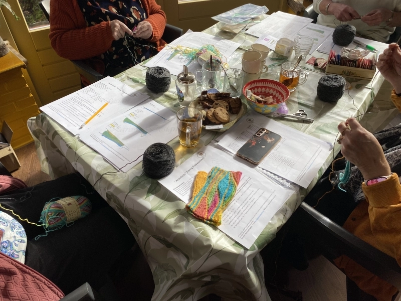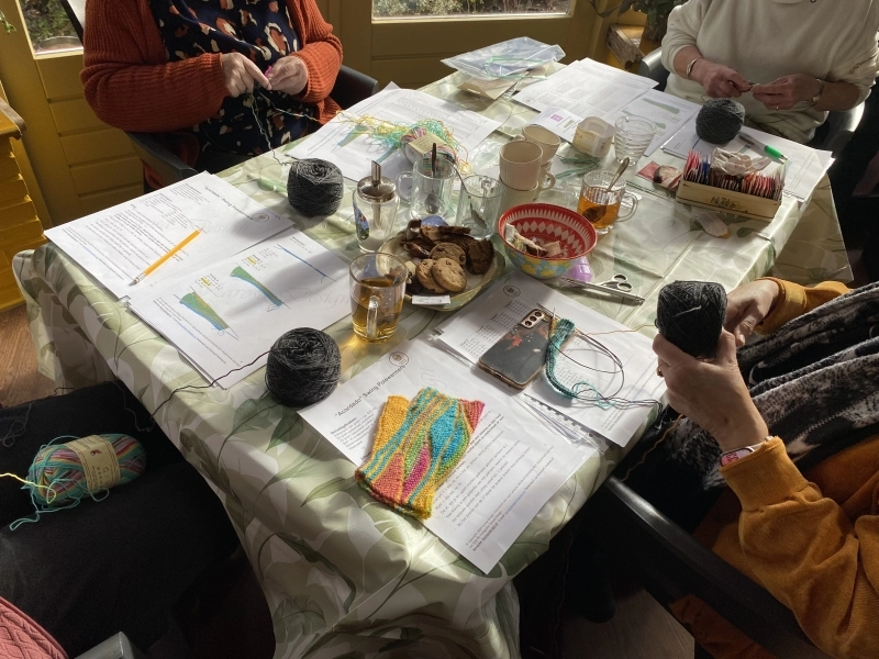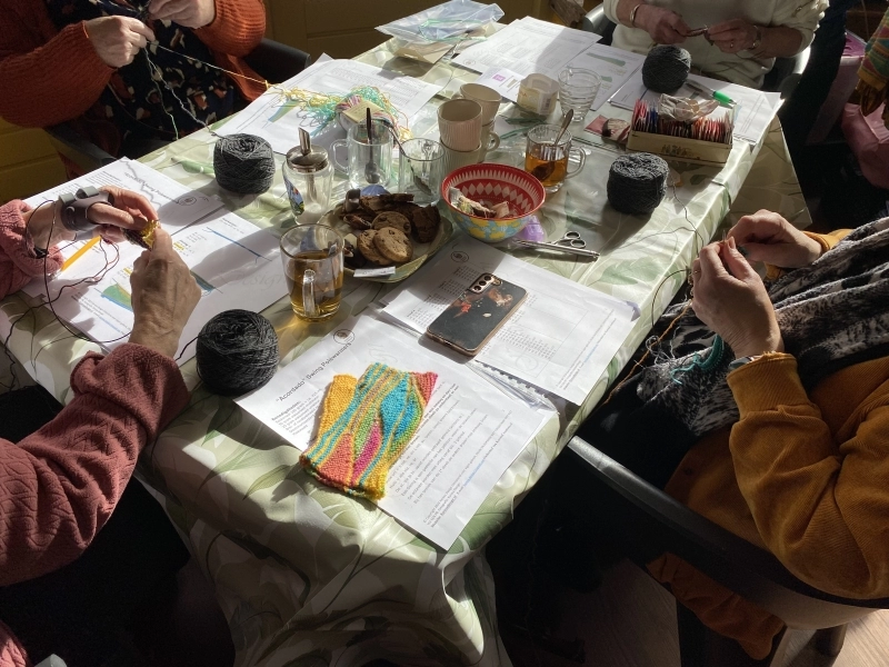 Op de foto's die ik maakte, zie je de opperste concentratie en het plezier van het ontdekken. Het is prachtig om te zien hoe de rechte lijnen onder ieders handen veranderen in die kenmerkende golvende beweging van de Swingende Polswarmers.